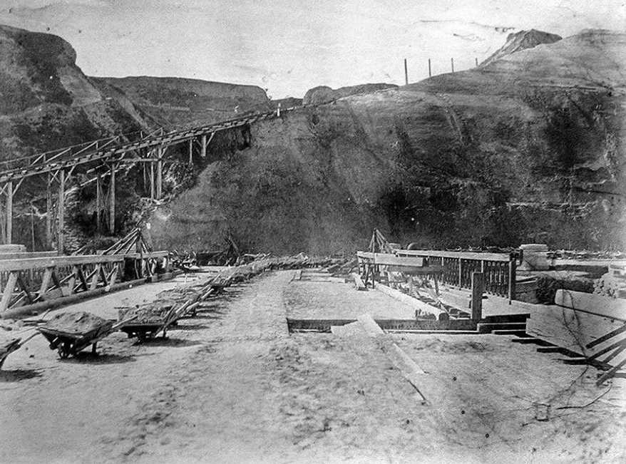 1852 р. Західна частина моста та узвіз у процесі будівництва
