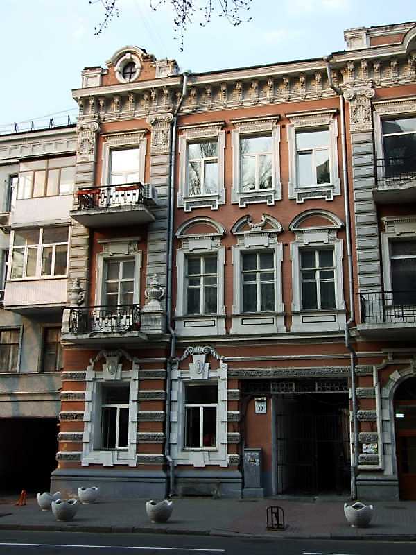 2009 р. Ліва частина головного фасаду Розмір зображення: 600:800 піксел 6 квітня 2009 р. Фото М.І.Жарких. Вкладені елементи Вікно 3-го поверху (+) Вікно 2-го поверху