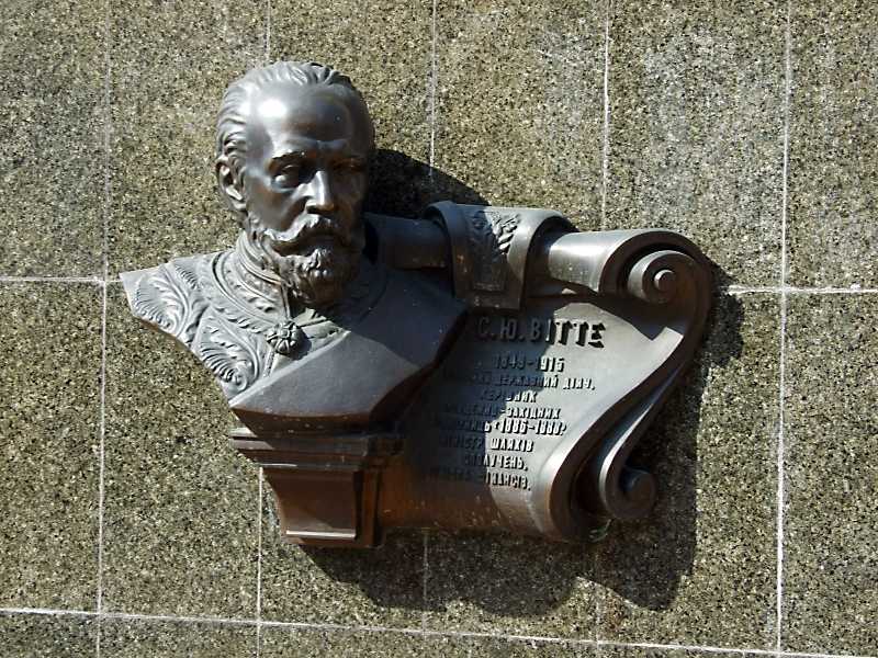 На дошці напис: «С.Ю.Вітте 1849 – 1915 відомий державний діяч, керівник Південно-західних залізниць (1886 – 1888), міністр шляхів сполучень, міністр фінінсів». Державний діяч Російської імперії, один з тих, що довели її до краху – справді «видатний»!