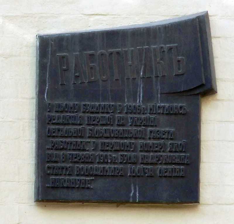 На дошці напис: «В цьому будинку в 1906 р. містилась редакція першої на Україні легальної більшовицької газети "Работник", у першому номері якої від 6 червня 1906 р. була надрукована стаття Володимира Ілліча Леніна "Накануне"».