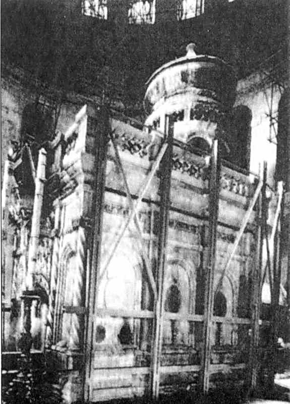 Інтер’єр церкви Гробу Господнього в Єрусалимі. Північна стіна зі сталевими опорами, встановленими в 1947 р.