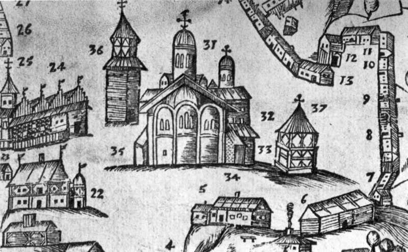 Фрагмент перспективного плану Києва 1638 р. з книги О. Кальнофойського «Тератургіма». Видання Києво-Печерської друкарні.
