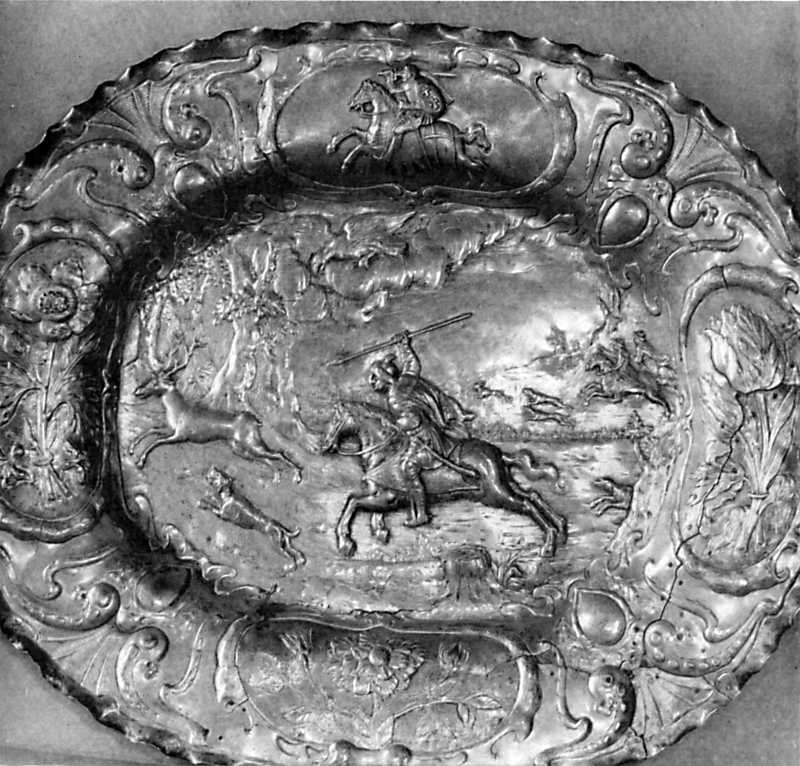 Срібне блюдо зі сценою полювання (18 ст.) з Києво-Печерської лавриРозмір зображення: 800:766 піксел Джерело: Логвин Г.Н. По Україні. – К.: Мистецтво, 1968 р., с. 59. |