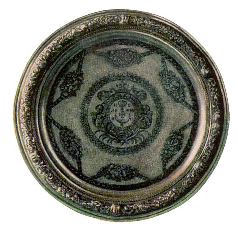 Срібне блюдо, карбоване, оздоблене черню. Перша половина XVIII ст. Державний історичний музей УРСР у Києві, № 2044