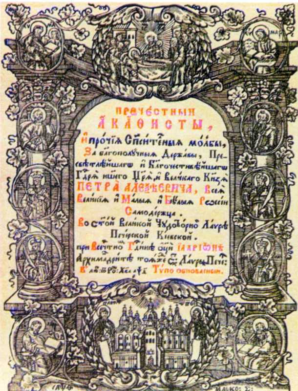 1709 р. Титульний аркуш книги «Пречестныи акафисты…»
