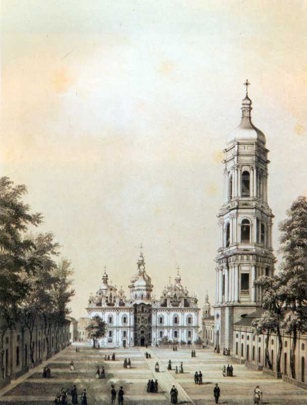 Вигляд Успенського собору, головної дзвіниці та келій лаври показаний з заходу.