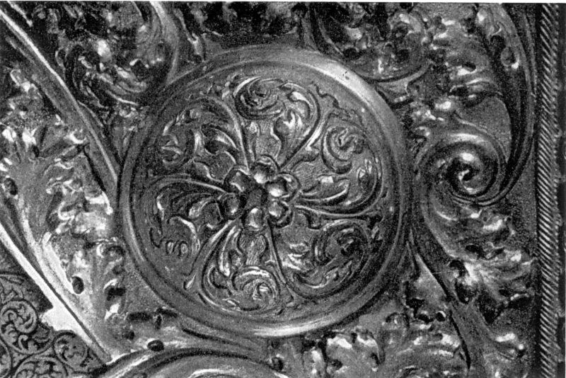 Нижня дошка, пукляРозмір зображення: 800:534 піксел Фрагмент спідньої дошки срібної оправи євангелія. Києво-Печерський державний історико-культурний заповідник, № 232 Джерело: Петренко М.З. Українське золотарство 16 – 18 ст. – К.: 1970 р., с. 193. |