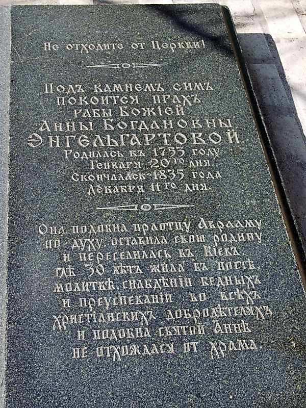 Могила А.Б.Енгельгардт (1753 – 1835)Розмір зображення: 600:800 піксел 18 вересня 2007 р. Фото М.І.Жарких. Ця могила розташована біля входу до галереї, що веде до Дальніх печер. Її видно на фото корпусу № 46 (на першому плані). |