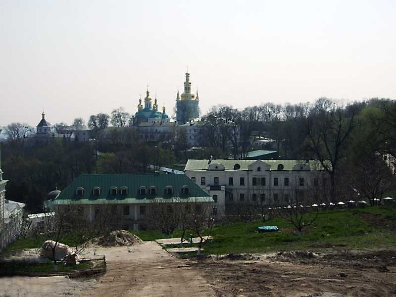 2009 р. Корпуси № 44, 45 на тлі Дальніх печер. Вигляд з півночіРозмір зображення: 800:600 піксел 16 квітня 2009 р. Фото М.І.Жарких. |
