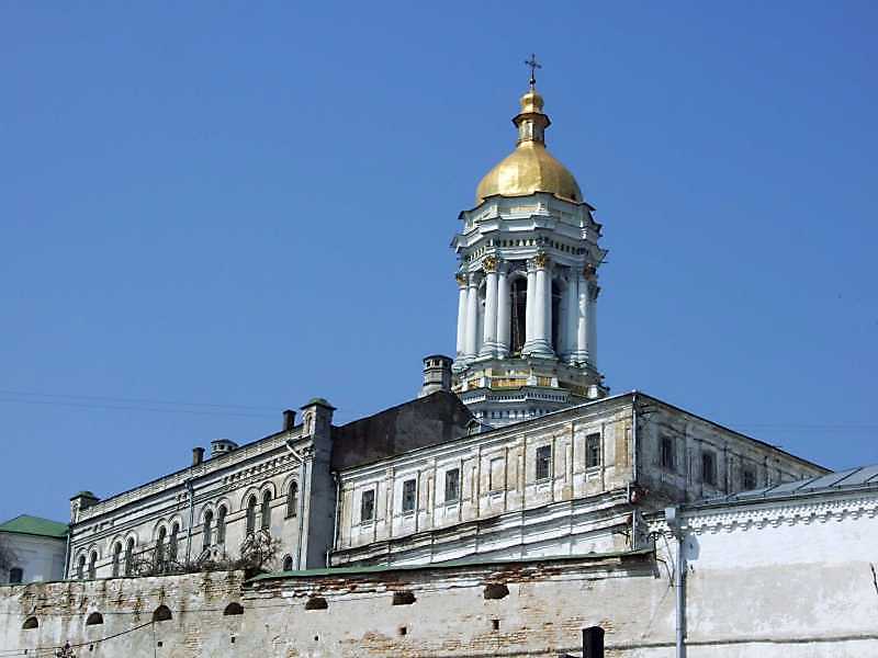 Благовіщенська церква (зліва) і кухня трапезної (справа) на тлі Великої дзвіниці. Вигляд з південного сходу. 16 квітня 2009 р. Фото М.І.Жарких.