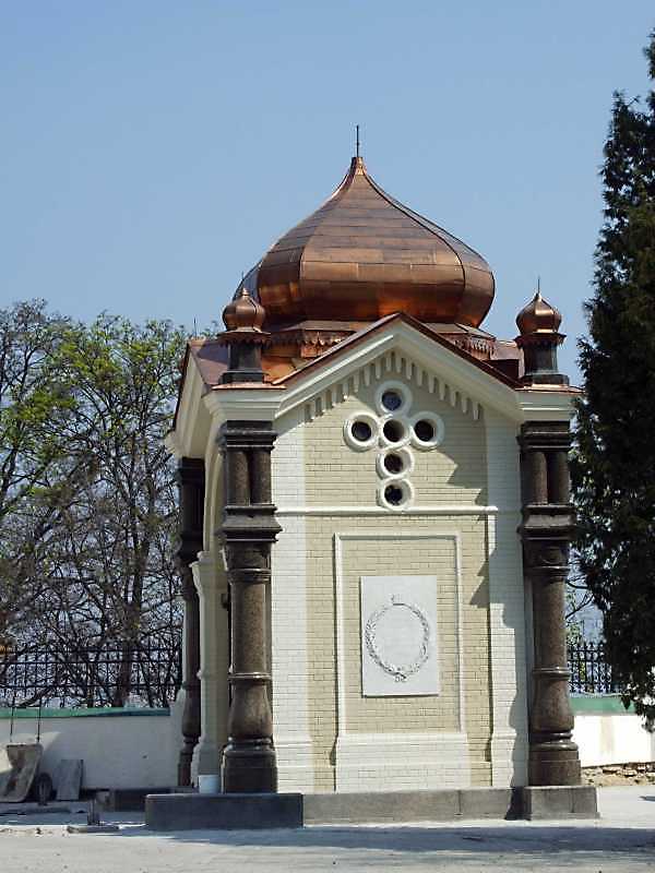 2009 р. Загальний вигляд із заходу Розмір зображення: 600:800 піксел 16 квітня 2009 р. Фото М.І.Жарких. Вкладені елементи Вікно у вигляді хреста Плита з написом