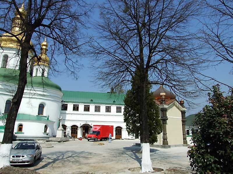 2009 р. Фрагмент церкви Воздвиження, вхід до Ближніх печер і каплиця Безака. Вигляд з півдняРозмір зображення: 800:600 піксел 16 квітня 2009 р. Фото М.І.Жарких. |