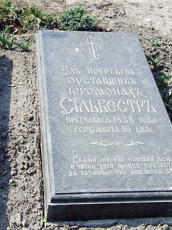 Могила ієромонаха Сильвестра (+1838) Розмір зображення: 600:800 піксел 16 квітня 2009 р. Фото М.І.Жарких. Попередня сторінка | Вище | Наступна сторінка