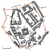 Шлях від головної брами, що розширювався в бік соборної площі, фланкували ряди одноповерхових келій «благочестивих отців і братій».