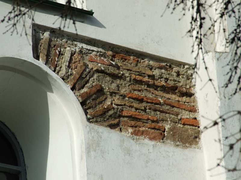 Зондаж з давньоруською плінфою біля вікна 2-го ярусуРозмір зображення: 800:600 піксел Фото М. І. Жарких, 20 жовтня 2013 р. |