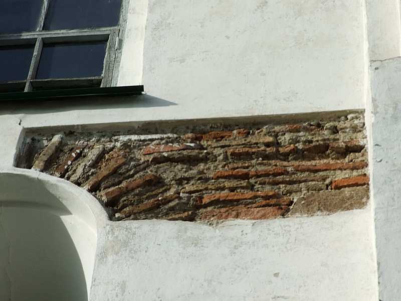 Зондаж з давньоруською плінфою біля вікна 2-го ярусуРозмір зображення: 800:600 піксел Фото М. І. Жарких, 20 жовтня 2013 р. |