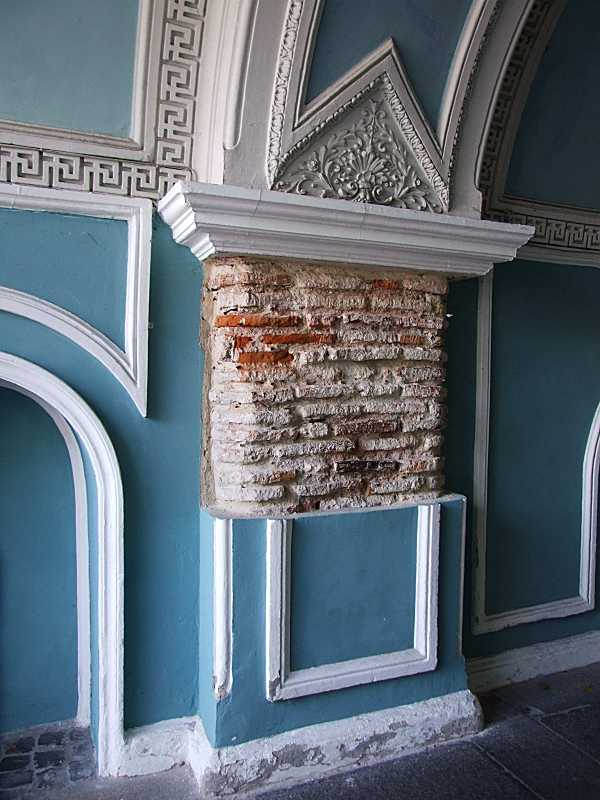 Пілястра із зондажем плінфи Розмір зображення: 600:800 піксел Фото М. І. Жарких, 20 жовтня 2013 р. Вкладені елементи 1976 р. Скульптурний фронтончик у проході Зондаж. Вигляд з північного заходу (+)