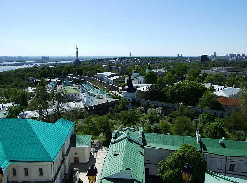 2015 р. Загальний вигляд з півночіРозмір зображення: 800:593 піксел Ліворуч – фрагмент будинку митрополита (2). На тлі південного двора верхньої лаври та Південної башти. Вид з 4-го ярусу великої дзвіниці. Фото М. І. Жарких, 4 травня 2015 р. |
