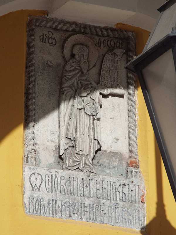Рельєф св. Феодосія (3) Розмір зображення: 600:800 піксел Фото Івана Парнікози, 16 жовтня 2017 р. Вкладені елементи Напис під рельєфом св. Феодосія