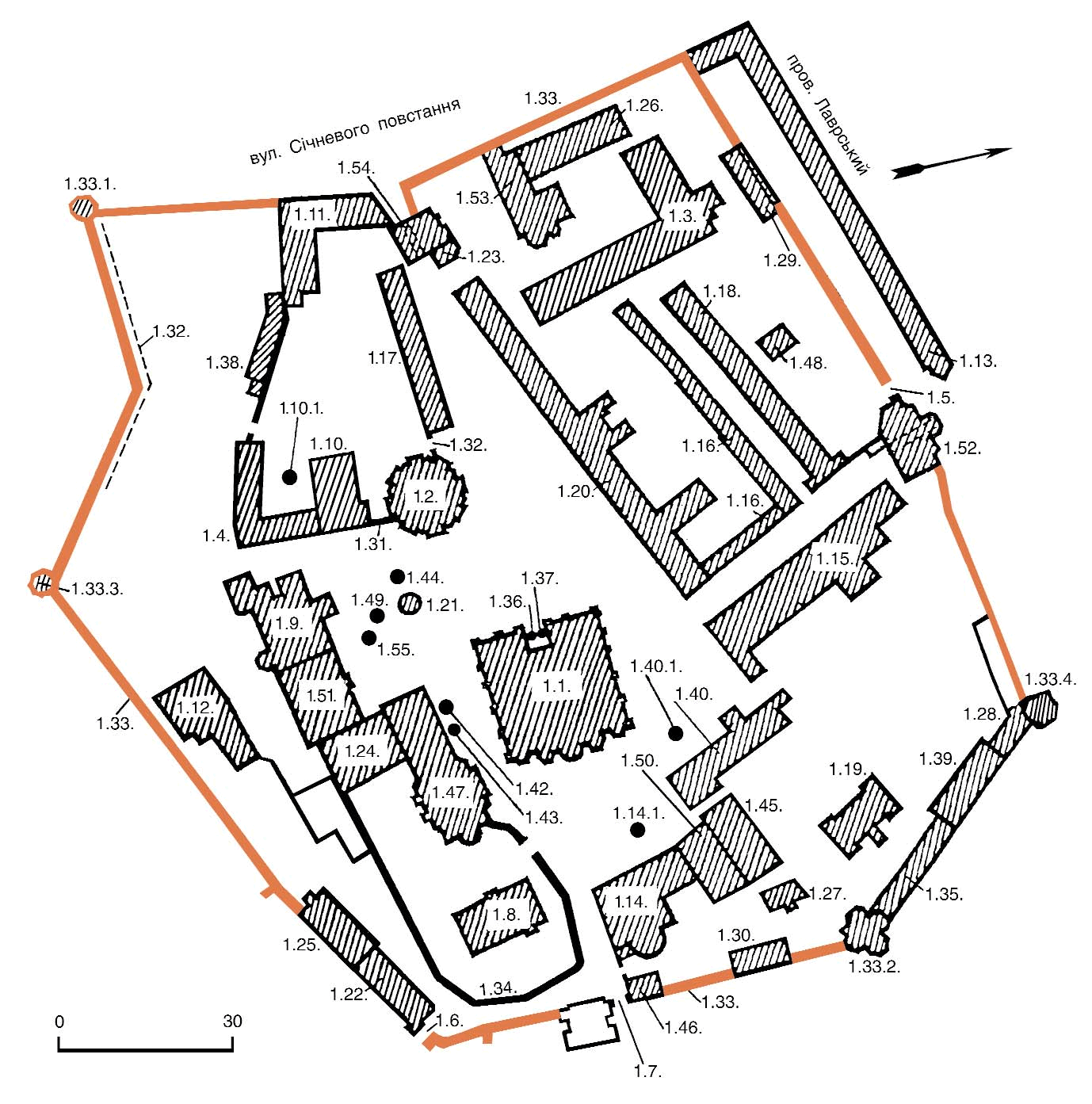 Генеральний план верхньої території ЛавриРозмір зображення: 1378:1393 піксел Джерело: Звід пам’яток історії і культури України. – К.: 2011 р., т. 3 (Київ), № 489-18. |