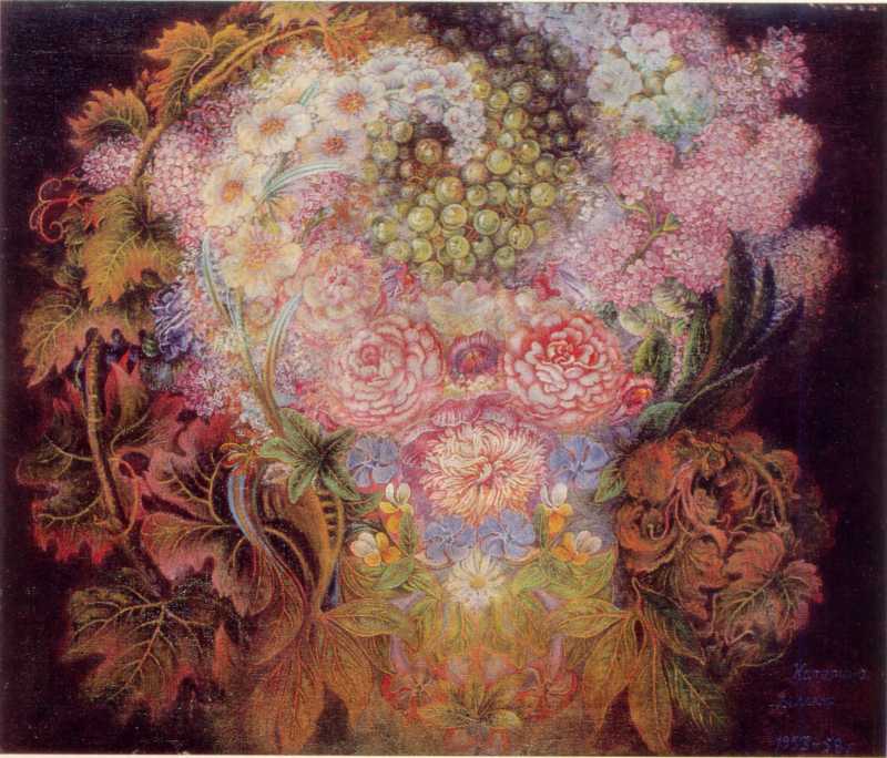 Білокур К.В. Квіти й калинаРозмір зображення: 800:684 піксел 54. Квіти й калина. 1958. Полотно, олія. 118: 85 см. Державний музей українського народного декоративного мистецтва УРСР. Джерело: Катерина Білокур. – К.: Мистецтво, 1975 р. |