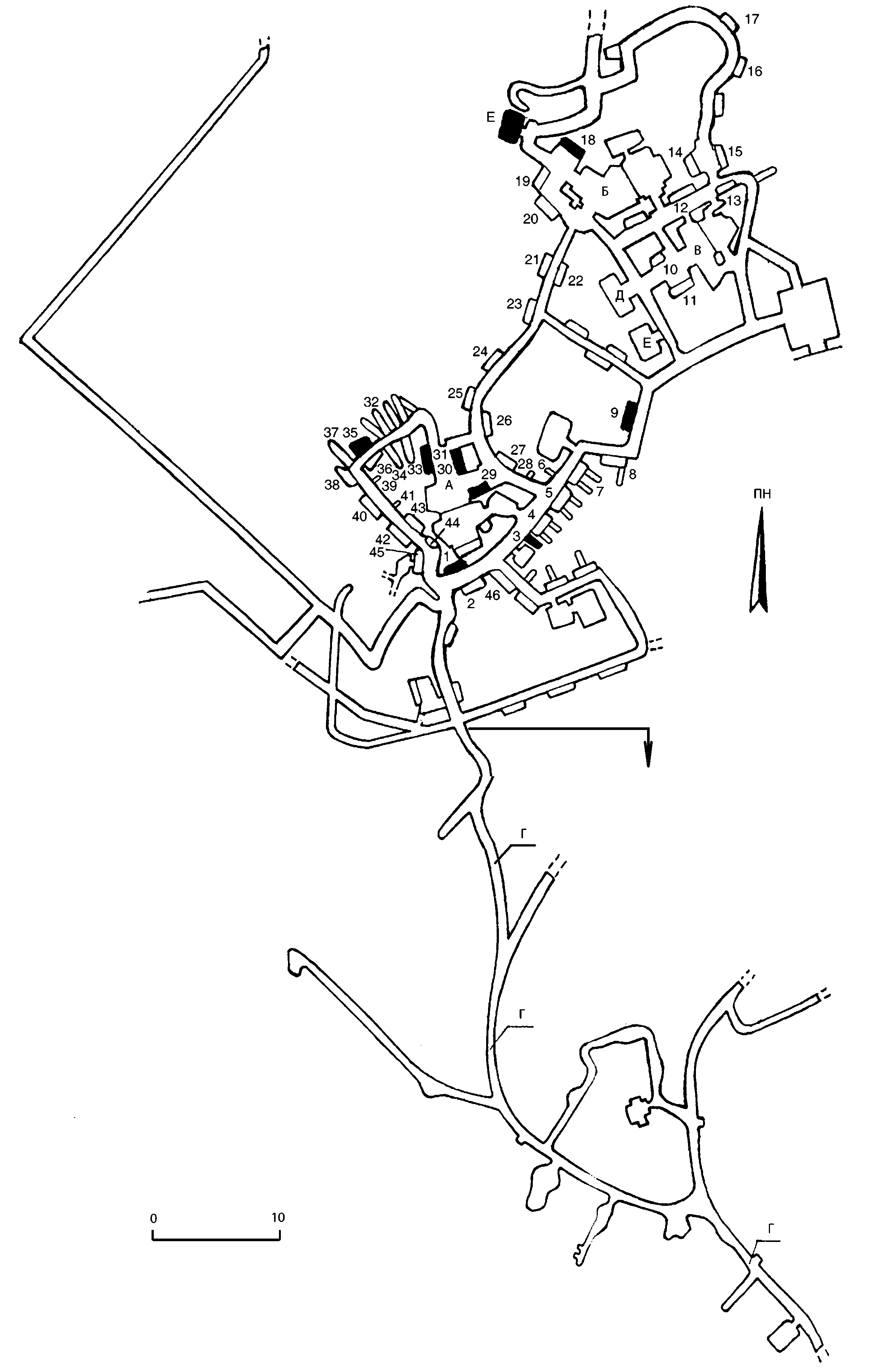 Південна половина плану – Варязька печера й підземні споруди № 1 – 17.