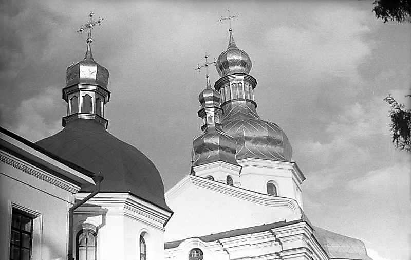 Верхи трапезної і церквиРозмір зображення: 800:506 піксел 1975 р. 22 листопада. Фото М.І.Жарких. Негатека, № A075-04. |