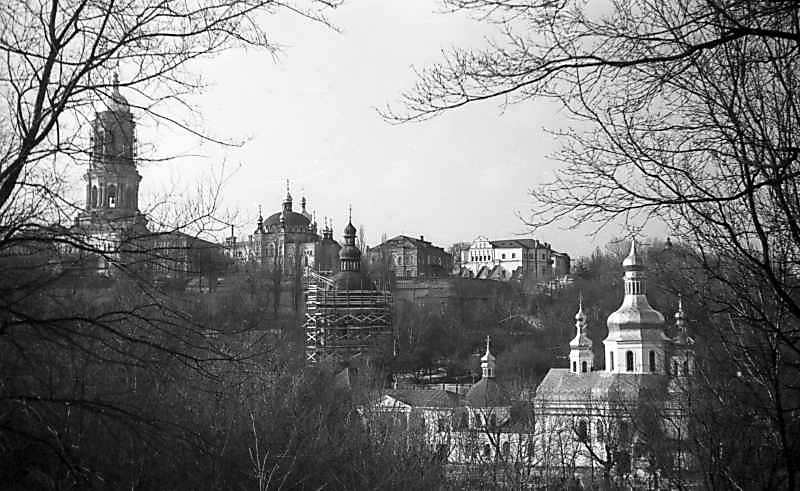 1977 р. Верхня лавра і Ближні печери. Загальний вигляд з півдняРозмір зображення: 800:491 піксел 1977 р. 4 березня. Фото М.І.Жарких. Негатека, № A234-08. |