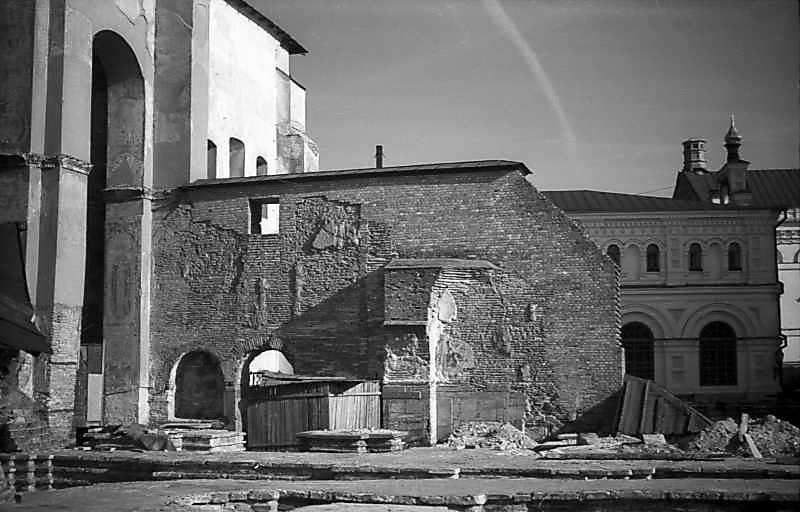 1977 р. Фрагмент стіни південної нави. Вигляд з півночіРозмір зображення: 800:512 піксел 1977 р. 7 травня. Фото М.І.Жарких. Негатека, № A256-28. |