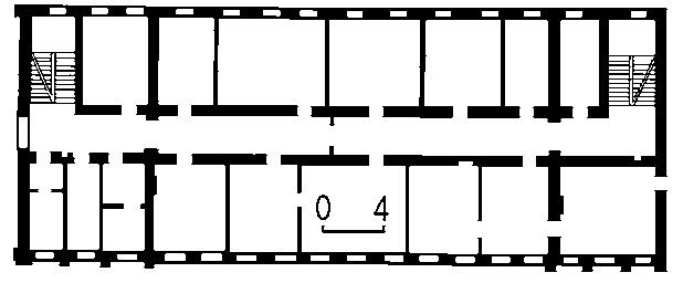 План другого поверху лікарніРозмір зображення: 618:256 піксел Джерело: Звід пам’яток історії і культури України. – К.: 2011 р., т. 3 (Київ), № 496-8. |