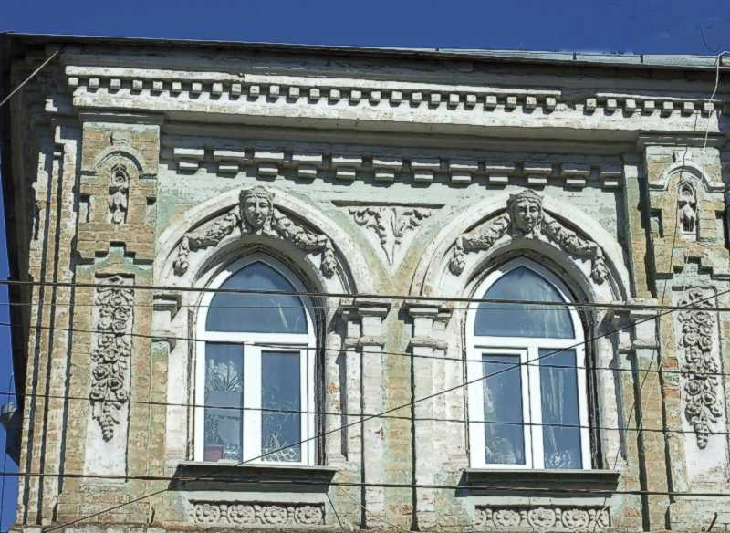 Вікна 3-го поверху Розмір зображення: 800:584 піксел Фото М. І. Жарких, 26 березня 2021 р. Вкладені елементи Маскарон над вікном