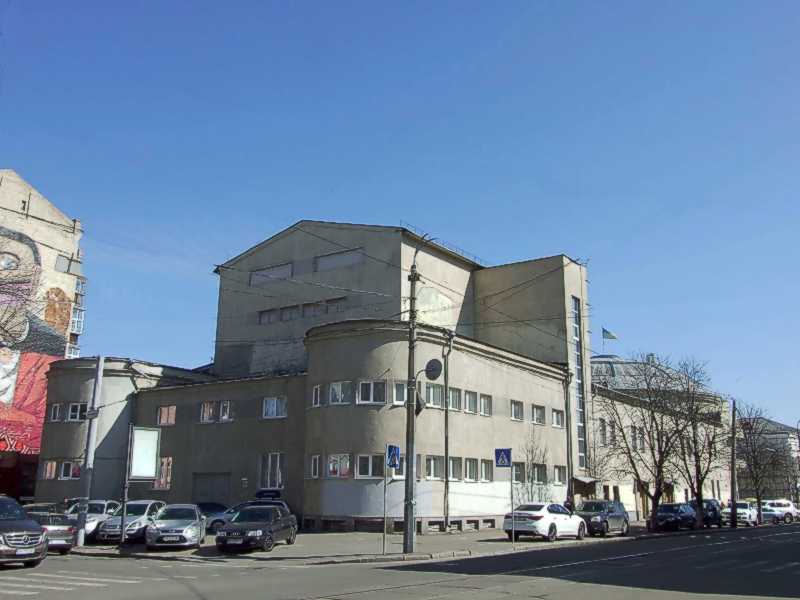 2021 р. Загальний вигляд із заходу (2)Розмір зображення: 800:600 піксел Ліворуч – вул. Спаська (на неї дивиться скруглена частина), праворуч – вул. Межигірська. Фото М. І. Жарких, 26 березня 2021 р. |