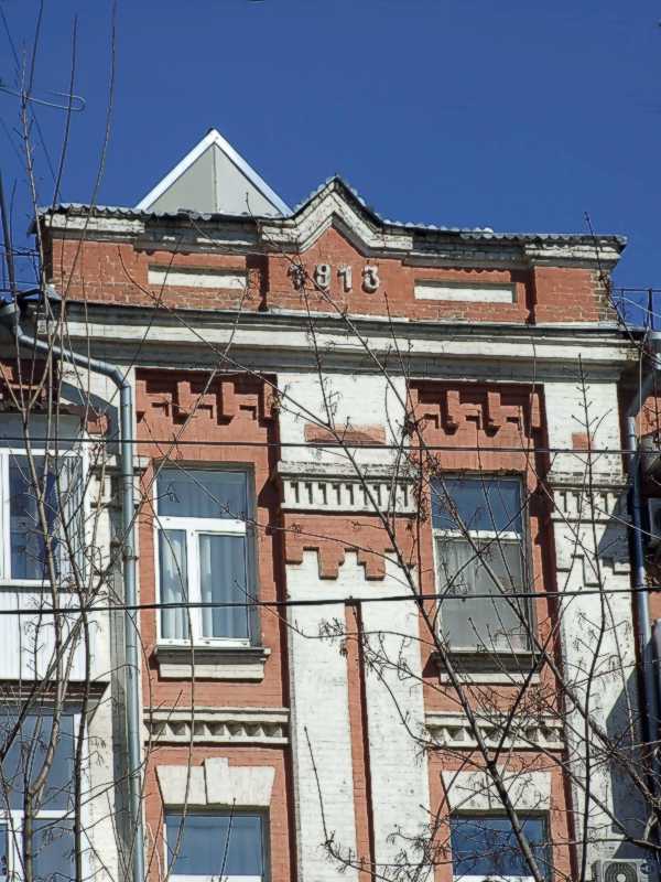 Вікна 4-го поверху і фронтонРозмір зображення: 600:800 піксел На фронтоні дата – 1913 рік. Фото М. І. Жарких, 26 березня 2021 р. |
