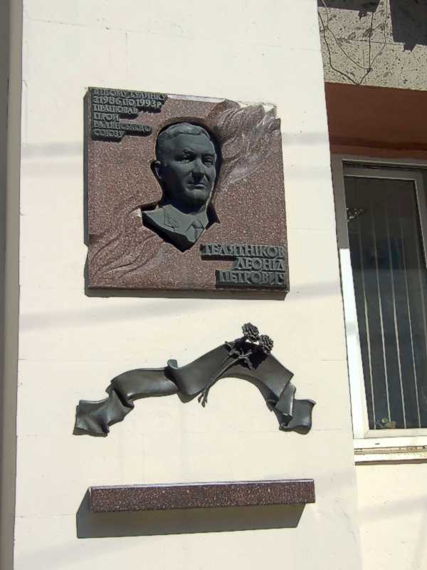 Напис: «В цьому будинку з 1986 по 1993 р. працював Герой Радянського Союзу Телятников Леонід Петрович».