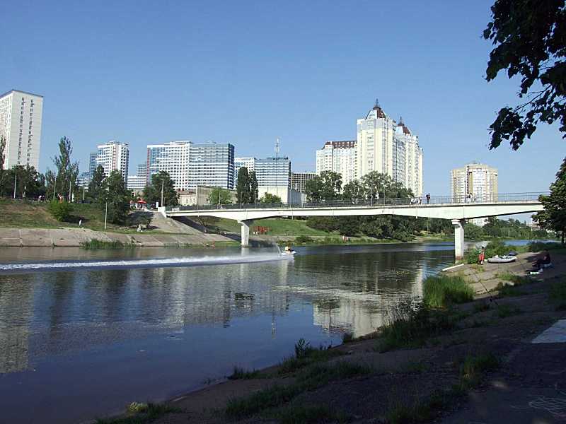 2020 р. Загальний вигляд із заходуРозмір зображення: 800:600 піксел Фото М. І. Жарких, 7 червня 2020 р. Над центром моста – висотний житловий будинок по вул. Туманяна, 15. |