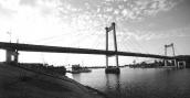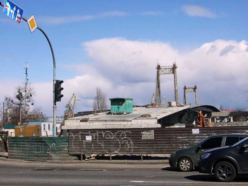На передньоу плані, праворуч – монтується новий міст. За ним на задньому плані, ліворуч, видно дві опори старого вантового моста, який демонтується. Фото М. І. Жарких, 23 березня 2021 р.