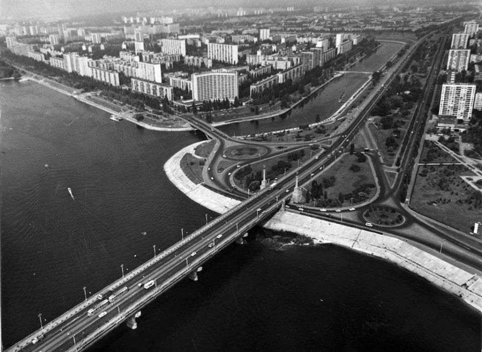 1980-і р. Аерофото моста Патона і РусанівкиРозмір зображення: 960:701 піксел Вигляд з південного заходу. Фото опублікував Emil Oleksandrovich 3.12.2019 р. |