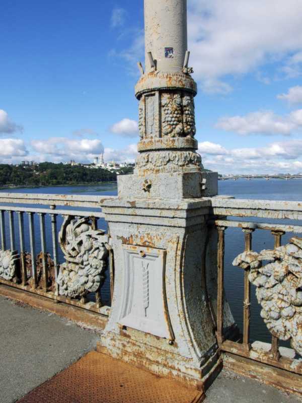 Основа ліхтарного стовпаРозмір зображення: 600:800 піксел Фото М. І. Жарких, 27 вересня 2021 р. Такими стандартними стовпами опоряджено весь міст. |