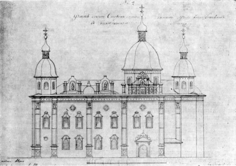 Собор Братского монастыря в Киеве, 1690-1693 гг. Арх. О. Старцев. Южный фасад. Чертеж серед. XIX в. (стр. 161)