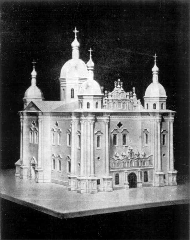 Макет. Вигляд з північного заходуРозмір зображення: 635:800 піксел Никольский собор в Киеве, 1690-1696 гг. Арх. О. Старцев. Макет. Музей НИИТИ АСиА УССР (стр. 178) |