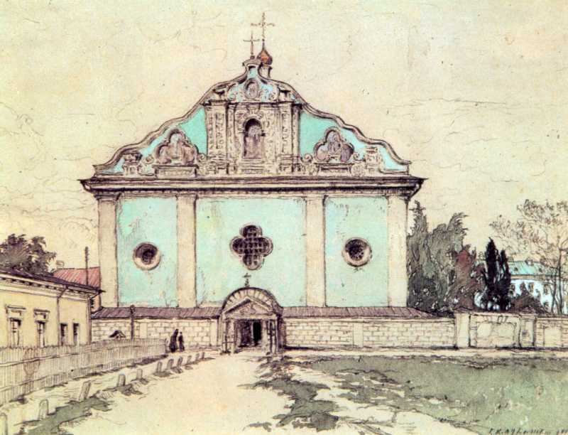 Католицькі ченці домініканського ордену, розібравши напівзруйновану церкву XII ст. у Вишгороді, збудували зі старої цегли великий костьол св. Миколи на Подолі. Він був закінчений близько 1610 р. Навколо нього невдовзі виник монастир, що швидко збагатів на податках з киян. Національно-визвольна війна українського народу проти польської шляхти 1648-1654 pp. змусила католиків тікати з Києва. У Миколаївському костьолі київські міщани й козаки влаштували шинок. У 1690-х pp. колишній костьол переробили на церкву Петра й Павла, де в 1744-1750 pp. замість готичного ступінчастого фронтону був збудований фронтон барокковий, дах зробили нижчим, всередині встановили іконостас тощо. Навколо нової церкви, що представлена на малюнку, виник православний монастир, в якому І. Григорович-Барський побудував нову дзвіницю.