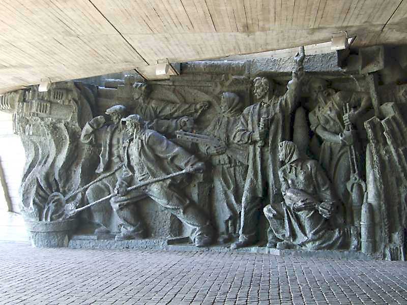 Ліва частина (промисловість) Розмір зображення: 800:600 піксел 8 листопада 2008 р. Фото М.І.Жарких. Вкладені елементи Сталевари Жінка з автоматами ППШ Комісар Робітник зі снарядом і дівчина з міною (+)