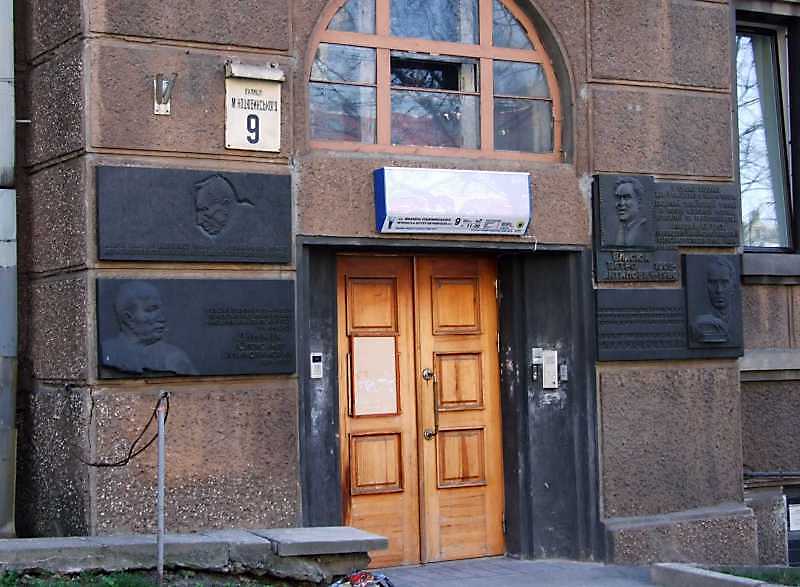 Вхід і меморіальні дошки Розмір зображення: 800:587 піксел 8 квітня 2009 р. Фото М.І.Жарких. Вкладені елементи Меморіальна дошка А.І.Кіпріанову Меморіальна дошка О.М.Дінніку Меморіальна дошка П.А.Власюку Меморіальна дошка Л.А.Булаховському