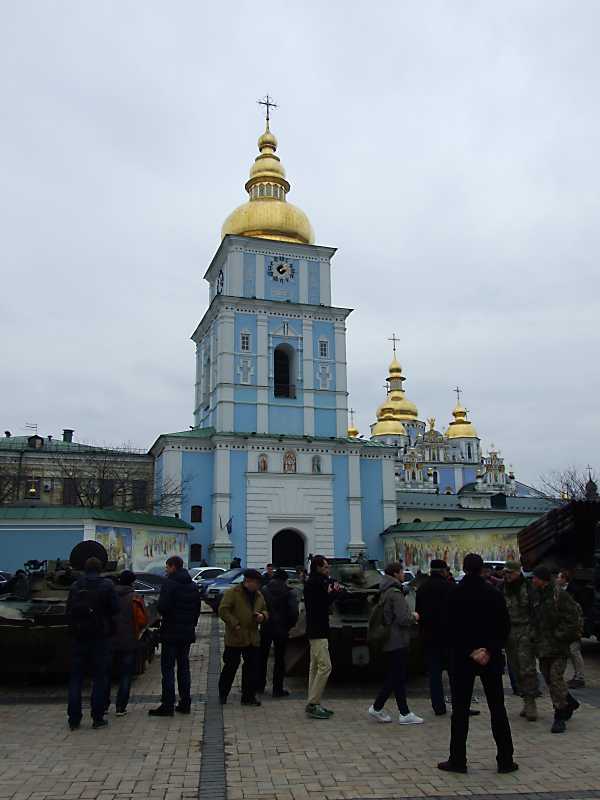 Бойові машини на тлі Михайлівської дзвіниціРозмір зображення: 600:800 піксел Фото М. І. Жарких, 26 лютого 2015 р. |
