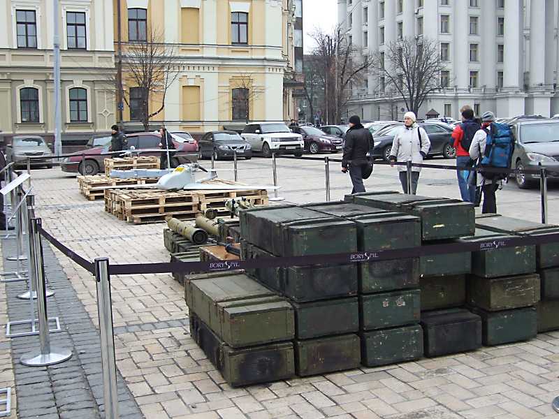 Ящики від боєприпасів, за ними – вогнемети «Джміль» та безпілотні літальні апарати – на тлі Дипломатичної академії (ліворуч), вул. Десятинної та Міністерства закордонних справ (праворуч). Фото М. І. Жарких, 26 лютого 2015 р.