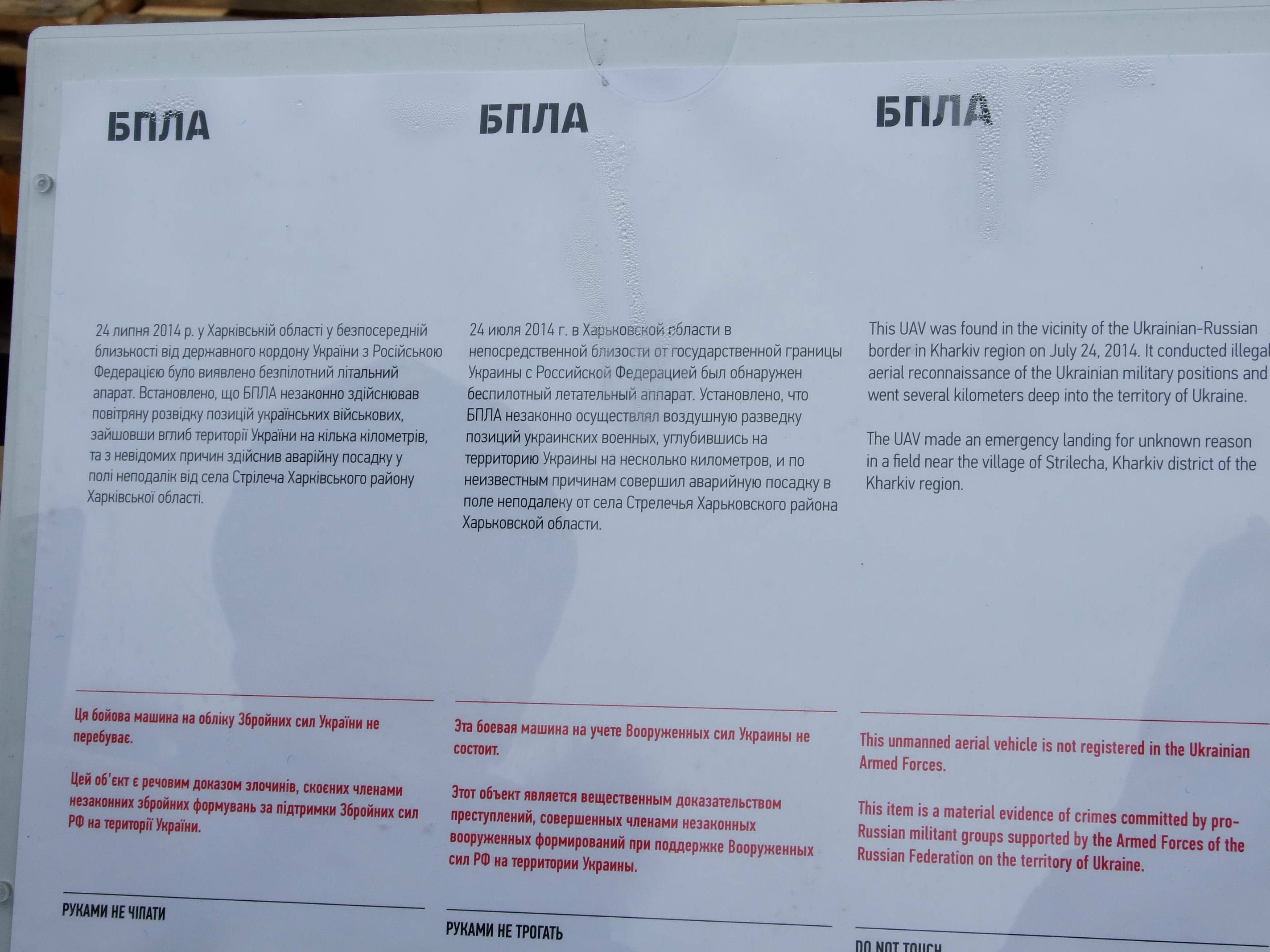 ПоясненняРозмір зображення: 2848:2136 піксел А оце чудо техніки упало на нашу землю біля с. Стрілеча Харківського району 24 липня 2014 р. Не дочекалась бідна тваринка, поки українські вояки її зіб’ють… Фото М. І. Жарких, 26 лютого 2015 р. |