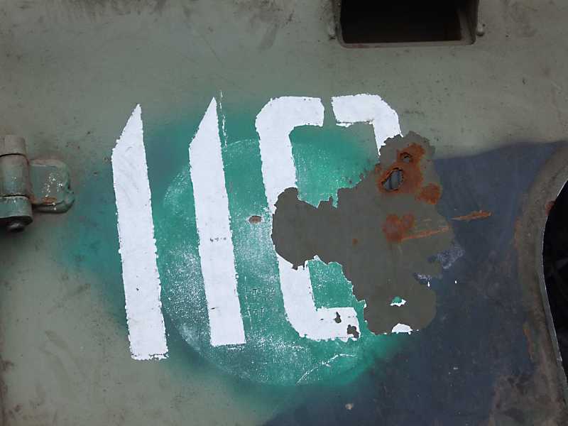 Бортовий номер – 110Розмір зображення: 800:600 піксел Але цікаво, що фарба облуплена і там жуде цікаві дірочки у броні. І звідки вони могли узятись? Фото М. І. Жарких, 26 лютого 2015 р. |