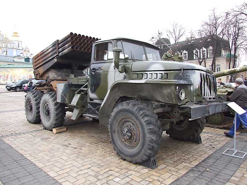 РСЗВ «Град» Розмір зображення: 800:600 піксел Фото М. І. Жарких, 26 лютого 2015 р. Вкладені елементи «Урал» – щоб ніхто не сумнівався... Блок пускових труб Але фар не вистачає... Вигляд ззаду у 3/4 (+) Вигляд ззаду (+)