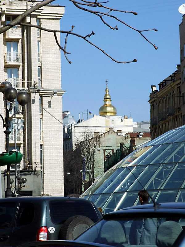 2009 р. Перспектива з майдану НезалежностіРозмір зображення: 600:800 піксел З видом на верх Михайлівського Золотоверхого собору. 3 квітня 2009 р. Фото М.І.Жарких. |