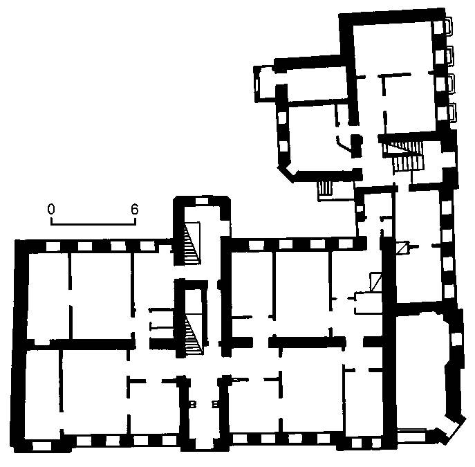 [2003 р.] План першого поверхуРозмір зображення: 687:675 піксел Джерело: Звід пам’яток історії і культури України. – К.: 2003 р., т. 2 (Київ), № 266-04-2. |